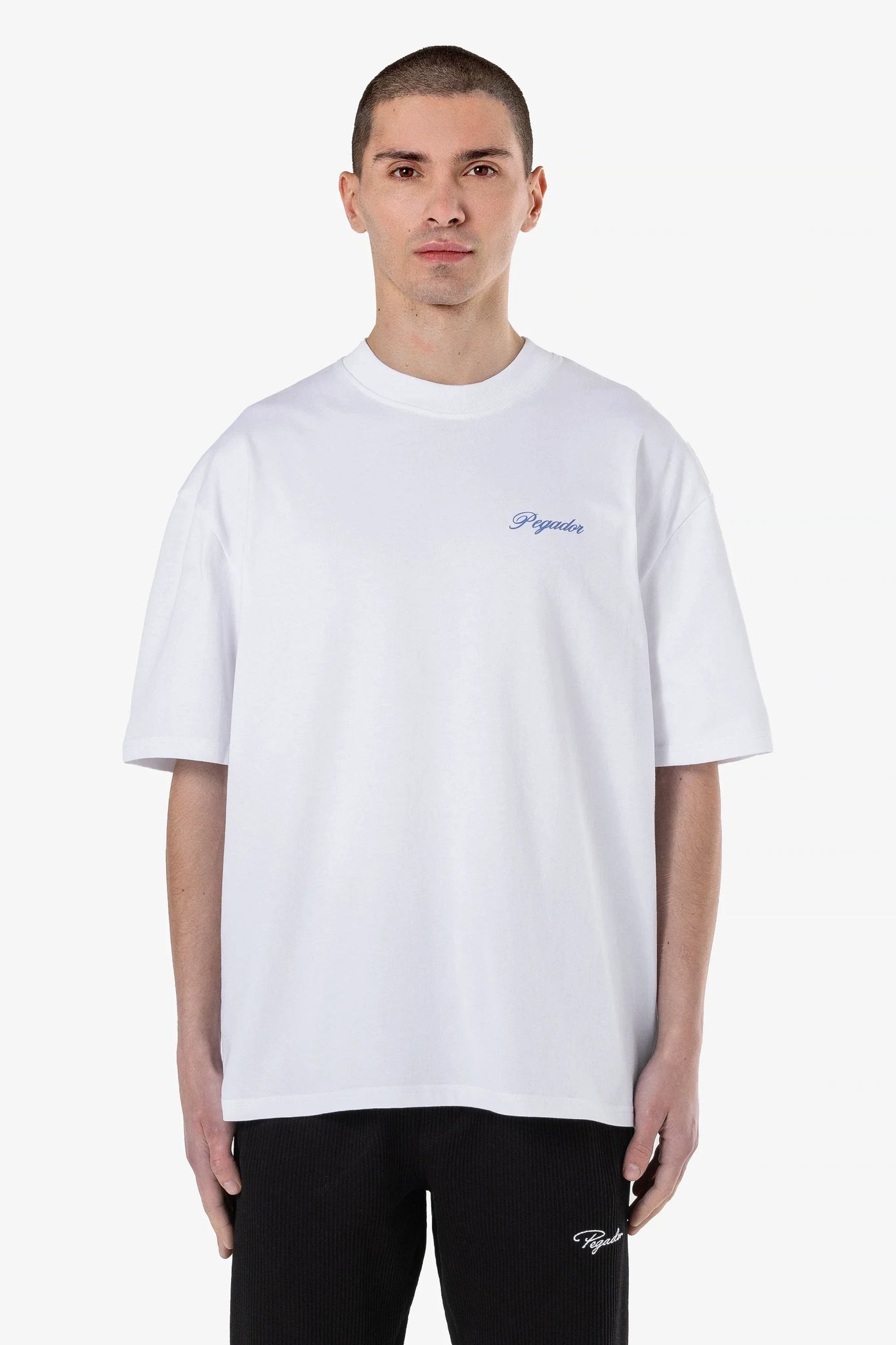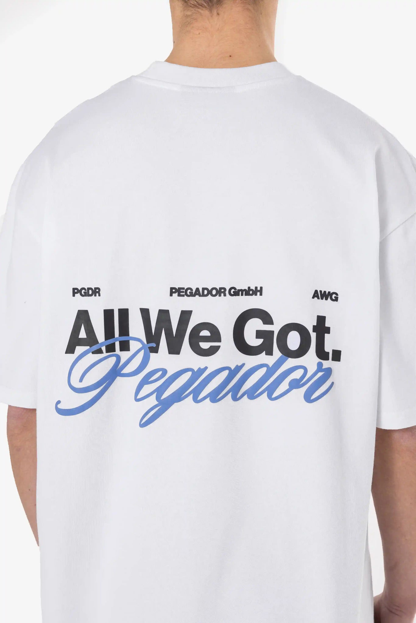 SWeißes oversized Tee aus dicker, schwerer Baumwolle mit fallenden Schultern. Pegador Logo vorne auf der Brust und großes Script hinten. Shirt aus der All We Got Kollektion.